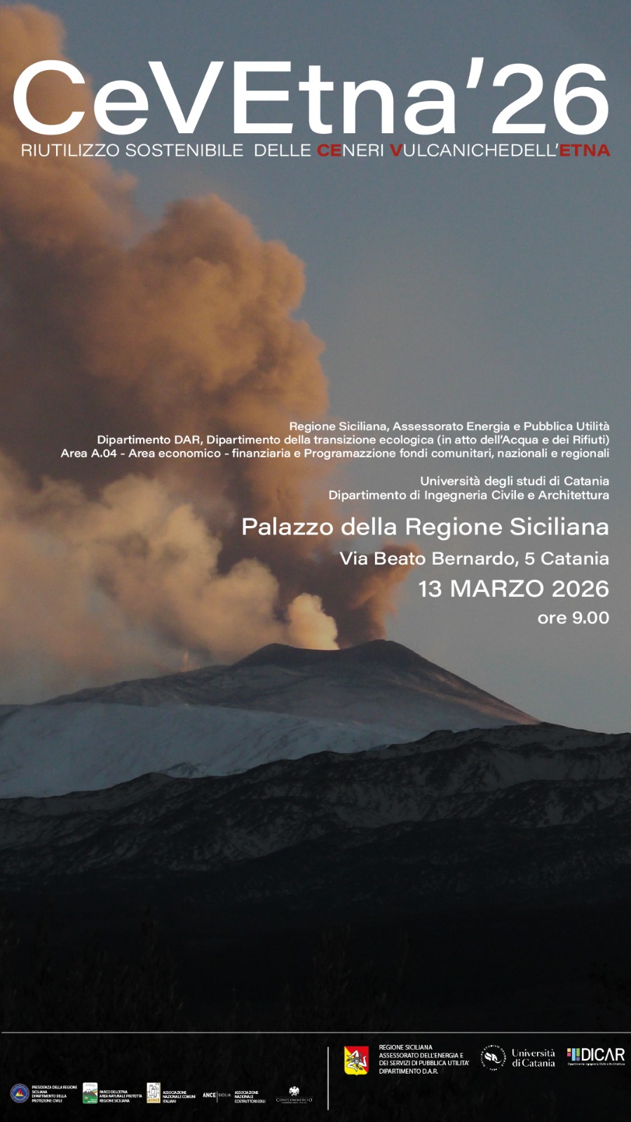 Giorno 13 Marzo 2026, presso il Palazzo della Regione, via Beato Bernardo n.5, CATANIA, si terrà il Convegno Tecnico-Scientifico CeVEtna 2026