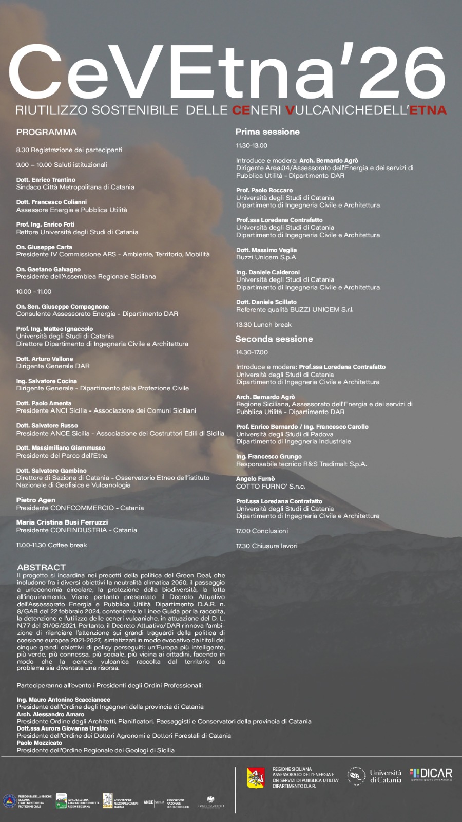 prevede due sessioni di presentazioni scientifiche sui temi delle strategie di riutilizzo delle ceneri vulcaniche dell'Etna e delle applicazioni in ambito edile, tenute dai docenti dell'Università di Catania, prof. Paolo Roccaro e Prof.ssa Loredana Contrafatto, ricercatori delle università di Catania e Padova, ingg. Daniele Calderoni e Francesco Carollo, includendo le testimonianze di rappresentanti del mondo delle aziende, Buzzi Unicem S.r.l., Tradimalt S.p.A., Cotto Furnò s.n.c.