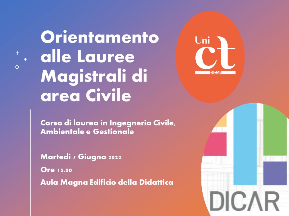 Martedì 7 giugno, presso l'aula magna dell'edifico della didattica si terrà un incontro di orientamento alla scelta della laurea magistrale per le studentesse e gli studenti del Corso di Laurea in Ingegneria Civile e Ambientale; sono invitati/e a partecipare anche studenti e studentesse del secondo anno del Corso di Laurea in Ingegneria Civile Ambientale e Gestionale. Interverranno la prof.ssa Musumeci presidente del Corso di Laurea in Ingegneria Civile delle Acque e dei Trasporti (LM-23), il prof. Roccaro presidente del Corso di Laurea in Ingegneria per l'Ambiente e il Territorio (LM-35), il prof. Rossi presidente del Corso di Laurea in Ingegneria Civile Strutturale e Geotecnica (LM-23). Modererà l'incontro il prof. Blanco, presidente del Corso di Laurea in Ingegneria Civile, Ambientale e Gestionale.
