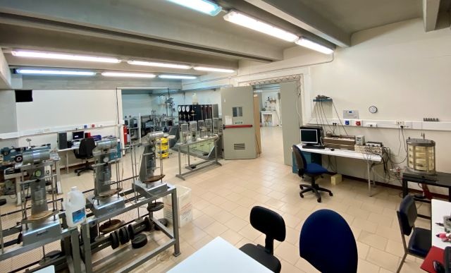 Il laboratorio ha una superficie di circa 260 m2 al primo piano dell’Edificio 13 ed una superficie di 40 m2 al piano terra dell’Edificio 13 con una superficie totale di 300 m2, destinata all’esecuzione delle prove geotecniche.